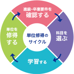 卒業のためには、卒業に必要な単位をすべて修得することが必要です。では、その単位はどう修得するのか。履修する科目を選び、その科⽬を学習し、試験に合格することで単位を修得できます。「科目を選び、学習し、単位を修得する」この繰り返しで積み重ねた単位が、必要な数に達すると卒業となります。