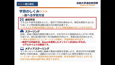 法政大学通信教育部では、通信学習、スクーリング、メディアスクーリングの3つの学習方法が用意されています。科目ごとに3つのうちのいずれか、または複数の学習方法で開講されます。それぞれ特徴が異なるので、自分の履修したい科目がどの学習方法で開講されているかも科目選びの重要なポイントです。